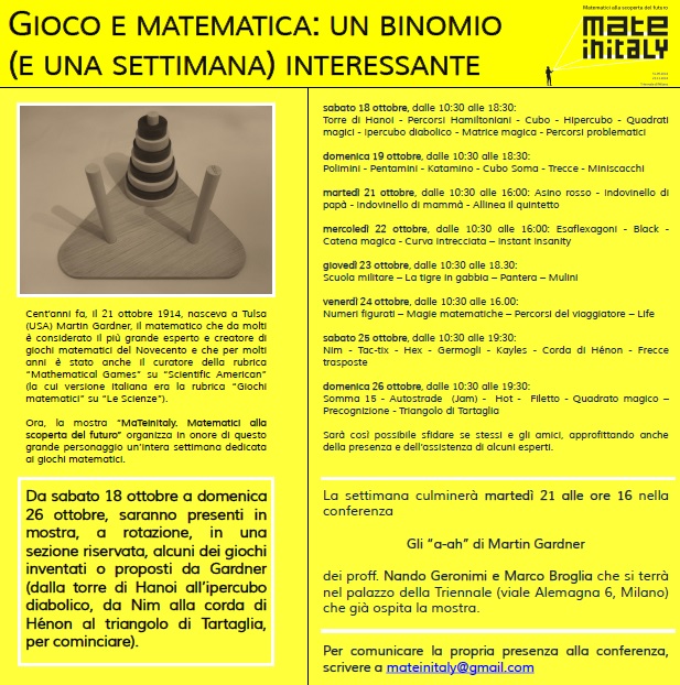 Per ricordare i 100 anni della nascita di Martin Gardner, il più grande creatore e divulgatore di giochi matematici del '900, all'interno della Mostra "MaTeinItaly" che si sta tenendo presso la Triennale di Milano verrà organizzata una settimana di "Giochi matematici". A partire da sabato 18 ottobre, fino a domenica 26, ogni giorno all'interno della mostra ruoteranno vari giochi ideati da Martin Gardner e curati nella loro spiegazione dal prof. Nando Geronimi.